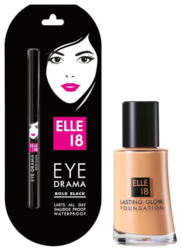Elle 18 Eye Drama Kajal, Super Black- Smudge-Proof, Waterproof, 0.35 G & Lasting Glow Liquid Foundation, 03 Shell, Shell, 27 Ml, Matte Finish