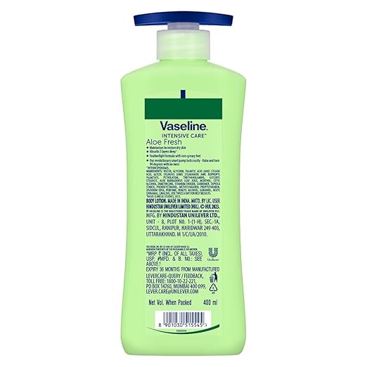 Vaseline Intensive Care, Aloe Fresh Hydrating Body Lotion, 400 ml, for Fresh, Hydrated Skin, with 100% Pure Aloe Vera Extract, for Dry, Rough Skin, for Men & Women